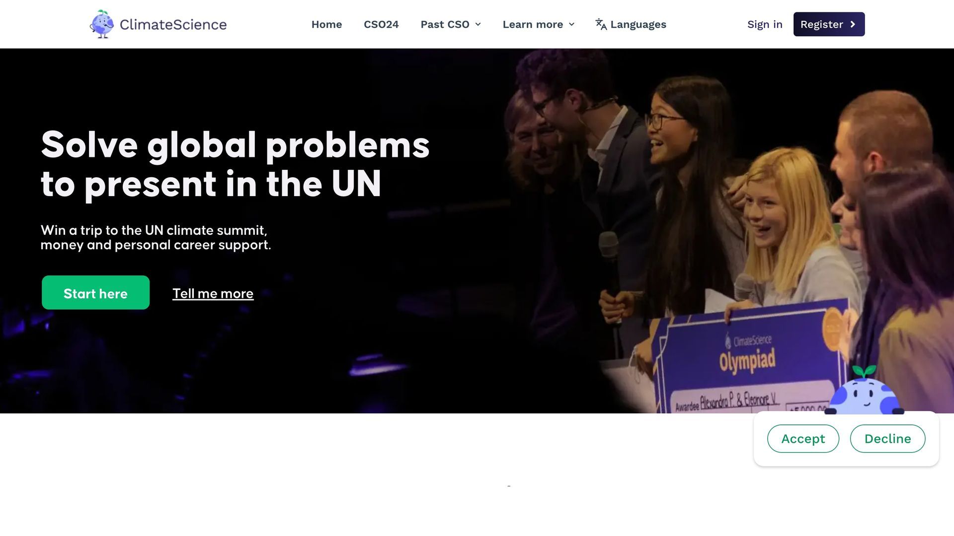 • Winners receive a sponsored trip to the UN Climate Summit, money, and personal career support. The top teams will be awarded with a sponsored trip to Baku, Azerbaijan during the UN Climate Summit, COP29.