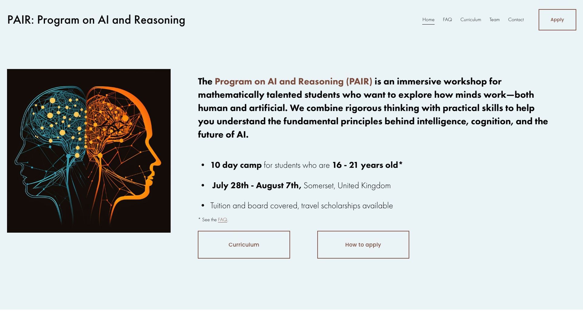 The Program on AI and Reasoning (PAIR) is an immersive workshop for mathematically talented students who want to explore how minds work—both human and artificial. It combines rigorous thinking with practical skills to help students understand the fundamental principles behind intelligence, cognition, and the future of AI. It is a 10-day camp.